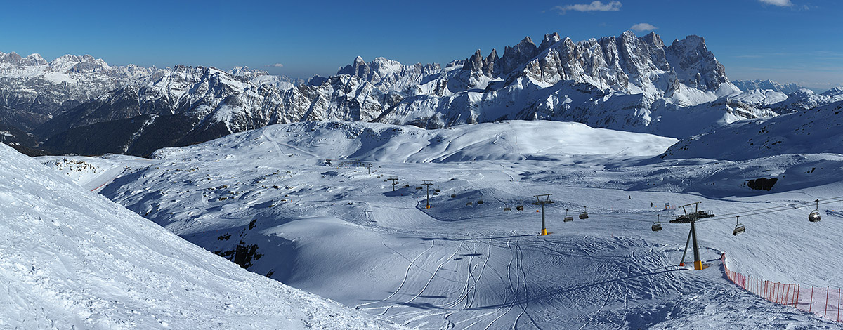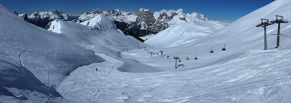 Snow in abundance. It was a particular snowy winter up there anyway, but having most of the slopes at around 2000 m altitude does help in this regard. The “pistenbullies” are working out every evening so each morning starts with perfectly groomed slopes.