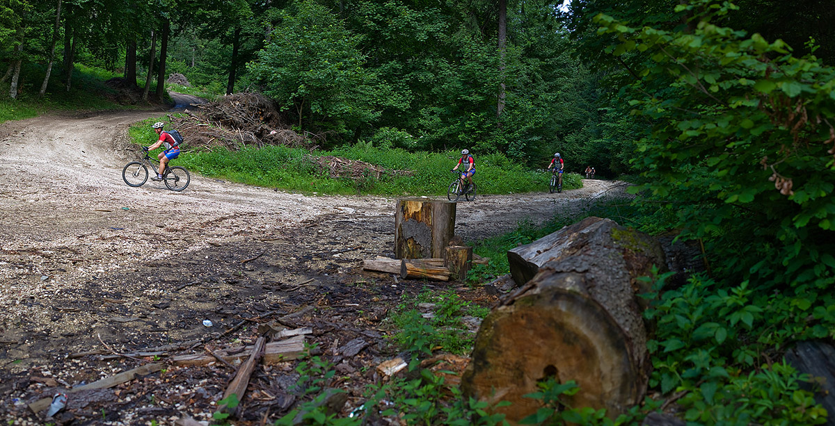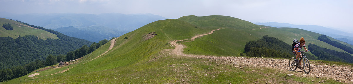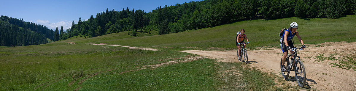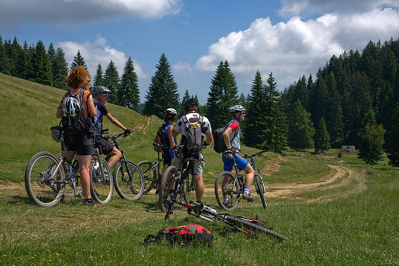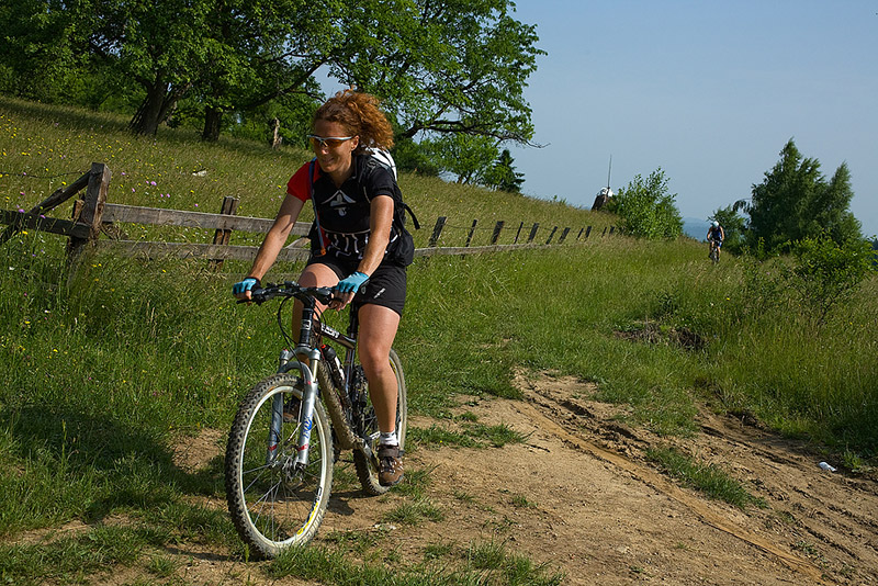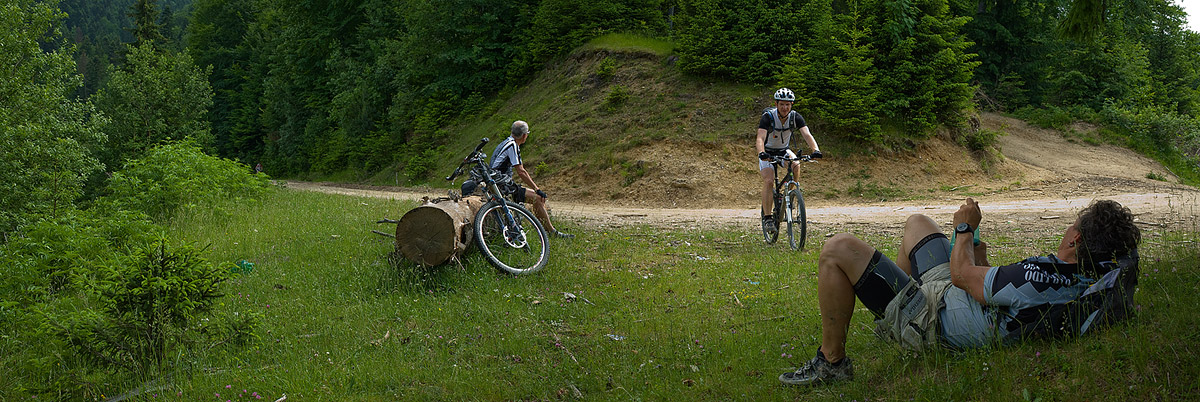 Baiului ridge, from Posada to Azuga. A strenuous ride from the very beginning, but the group had asked just for that. Judging by their bikes (three had Shimano XTR and one had Deore LX, all of them fairly light, given the full suspension), their request seemed completely justified. And so it was, they did really well – better then the guys I had taken on the same ride a month ago. It’s true that we had bad weather then and Iulian who was a beginner brought down the group average. But now, on the other hand, it was extremely warm, and two of the bikers were girls who also did really well through the entire week.