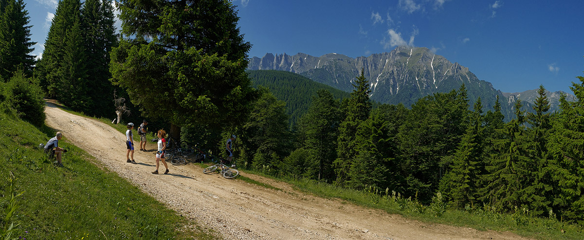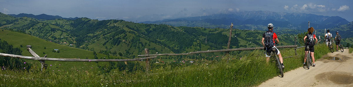This tour from Predeal to Poarta is quite special because of how the scenery changes on you. You start by cycling up with the north eastern wall of the Bucegi hovering above you. Then, after some cycling on a dirt road through the woods without really seeing much, you emerge into a completely new world, with rolling hills dotted with cottages and hey stacks, surrounded on one side by the Bucegi Mountains and on the other by Piatra Craiului mountains. This is the stunning view of Bran about which a Swede from a hiking group I once took there in 2009 told me that it was the most beautiful landscape he’d ever seen in this life. And he had seen a lot of places. My bikers were also enchanted and while June is not the best month because the humidity cripples the visibility, it does compensate through the many shades of fresh green spreading before your eyes.